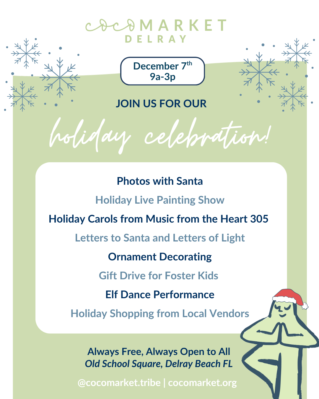 9aYoga FlowDakota Dawkins9aMain StageKids YogaSprouting Souls9aFamily Forest10aLive MusicAba Zions10aMain StageSound HealingLauren Mezera & Company10aHealing OasisKids MindfulnessThe Motion Lab10aFamily Forest11a11:11 MeditationOourglass11aMain StageFree Photos With SantaSonder Visuals11aFamily ForestKids Sound and ColorHeart to Mind United11aFamily Forest11:30aYoga SculptThe Hot Room11:30aHealing Oasis1:30pEcstatic DanceJennayni1:30pMain Stage1pChristmas Carolers305 Studio Holiday Music1pMain Stage12pLive PaintingSigel Arts12pMain StageAstrology for KidsLittle Mystic School12pFamily Forest